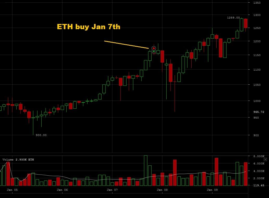 I think at this point I had gotten a bit tired of losing on XRP and I wasn't confident it would come back up so I switched gears and did a couple more trades with Ether. The first was January 7th 2018 at 10:01 pm for just a small $7.00 gain. I was in at $1164.25, out at $1173.00. The second was 2 days later on the 9th, in at $1330.00, out at $1282.91 for about a $33 loss.