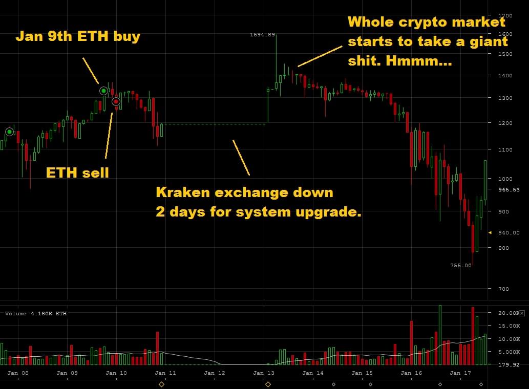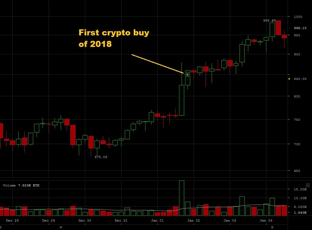 January 1st 2018 at 9:16 pm I made my first trade of the new year with Ether. I'm back to time traveling on these charts so I can't show you much detail of what was going on. Unfortunate because my brain doesn't remember the details either. This here is a 4 hour chart so you wont see my exit, it's buried under my entry. I was in and out in a little over 15 minutes, I took a small loss of $3.00.