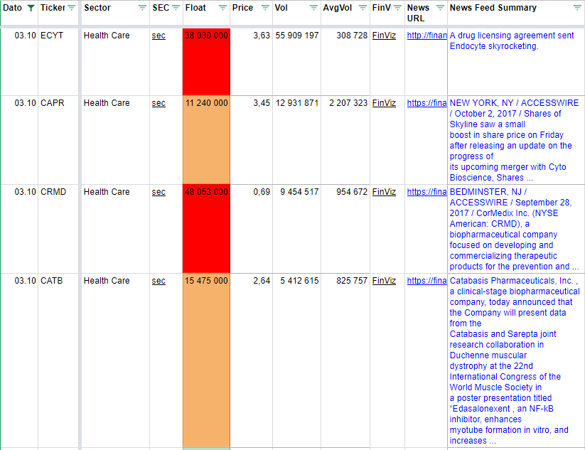 I just revamped my watchlist, moved it from Google Doc to Spreadsheet, and incorporated data from different sources, to automatically fetch news and stock information, like float, sector and volume.
