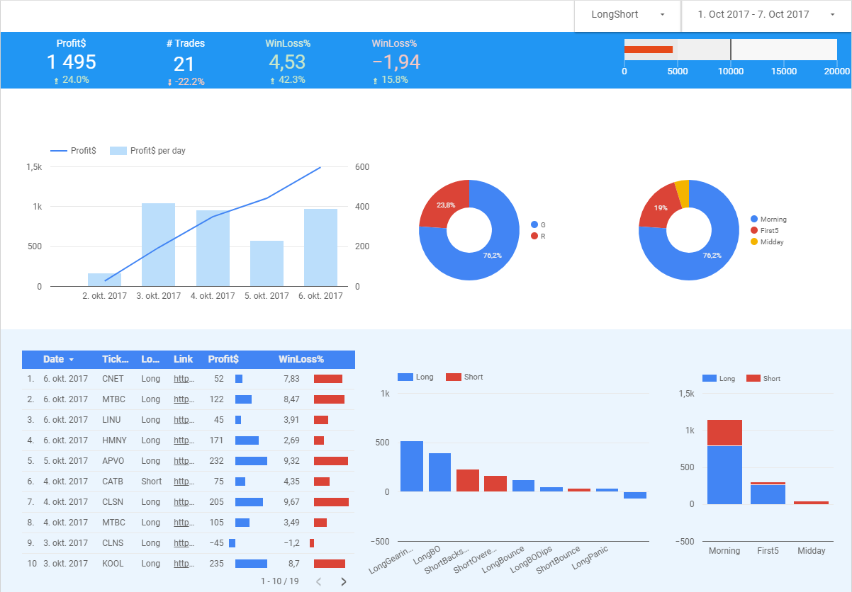 In Data Studio you have to connect to a data source, like databases, Google Analysis, Excel, or Googe Spreadsheet that I use. When opening a new Data Studio project, that's the first step. If you use the template, you go to resources and "administrate data source". It will do the import for you. I add the data myself, but have categories/drop downs to choose long/short, and there are calculations, so only really need to add ticker, # shares, in and out price. Long gearing is just this gearing/ab