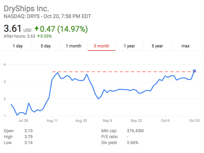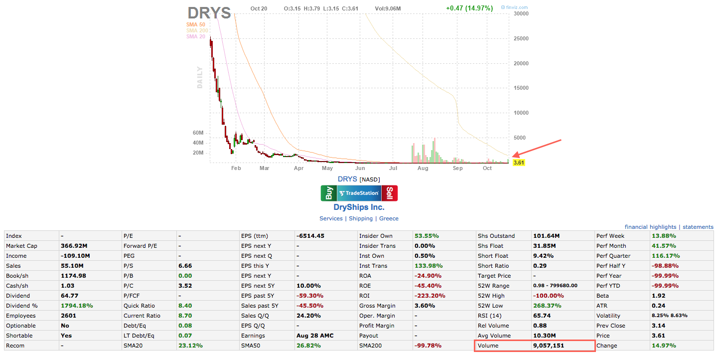 huperauxano Oct 24, 17 7:20 PM@Bryan3121 DRYS was the big mover last year - huge short squeeze so traders remember this ticker. Volume coming in and shorts getting squeezed is the catalyst. Didn't take off huge yet but I am watching it and got a small profit off it...