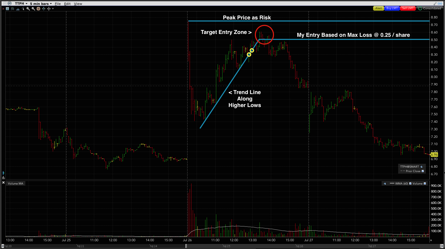 Good learning trade to follow up on Tim's 'Don't Trade Intraday' lesson. I was off on short entry timing by a half hour - was too eager to get in and should have waited more patiently for right setup. Yellow dots are my short entry and buy to cover for a minor loss. Target entry should have been the red circle (magnetic half-dollar mark) that would have contained my risk and kept me in the trade. Not going to increase my share size until I start hitting these mofos. Keep refining strategy, timing, managing fear by being in better setups.