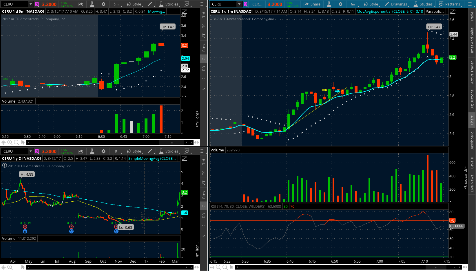First off, hindsight is 20/20 and anybody could say $CERU was a play to hold until the low 3s, but with this current slow market and low performance on momo stocks, I kept my risk level pretty tight knowing there could be a crash right after. Perhaps my risk wasnt set properly. I was hoping anybody here could show me their proper risk level based on the entry i had (yellow arrow. exit was the blue arrow).