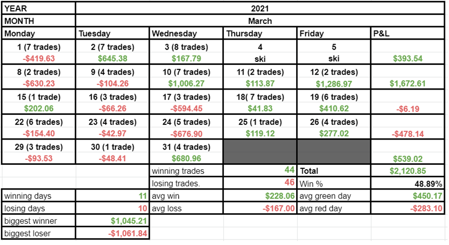March 2021. major market shift from Jan/Feb, had a bit of a tough time adapting, nevertheless, many good lessons taken away. Still working on increasing avg win/avg loss, aiming for minimum 2R.