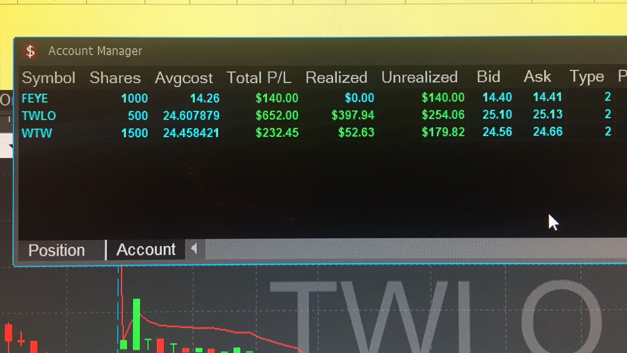 Hey guys, hope you had a nice day. yesterday I was more stable with the knowing when I am wrong cause this week I have had the right idea on 80% of the plays in general but after in the dead zone from 12-3 pm got stopped out multiple times and gave back to the markets for no reason. yesterday TWLO the money play I mean look at the chart and look at my list. I got in pretty much on the third 5 min candle the one that finished green with a big down wick and signaled further upside while volume was decent. I have a picture for you guys- I can generally post a picture every day but some days I am busy managing trades and stuff so i dont take pics. It went as high as 26.5 lol my pt was around 26$ so very proud for the call- EASY MONEY. WTW - Oprah's gem was decent in start but I am very unhappy with my bad avg at 24.45 sold into the 3rd top at just under 25$ and what timing - it was showing weakness at the top and stuffing into 25$, just as I got out with 3/4 of my position it collapsed and got stopped out on that 1/4 but its a part of the game. FEYE also not the best avg and believed in it to much it washed as I predicted to a very nice level but was busy with other two and got a shitty avg and minimized my gains, but that trade payed for commissions LOL. In general nice day, sad thing is my OCN call was FANTASTIC and it just faded all day but did not catch it cause of other ones but you cant catch them all. Its not natural and traders should never be sad because they missed out on a trade- there will be chances and opportunities all along every day and just try and pick the right ones, never be sad you missed a play because you never know what could have happened in it, maybe you could have gotten stubborn to the other side and had a big loser. Be happy for what you made and when you lose let it be a lesson THE END. Trading is a very easy job if you learn what your good at and push that to the limits of perfection. Dont try trade 24 tickers and 3 instruments with a forex trade going on also because you will overwhelm your self with it. I have traded tons of trades and made money and lost money and now do it as a profession and still I only have 4-5 stocks I watch every day in my 4 monitors, with one of the only the SP, crude, EUR/USD and gold to keep track of important stuff. The other ones are big charts with level 2's and tape and one is chat and intraday scanners. So even I am not ready for more yet and I am keeping it that way.