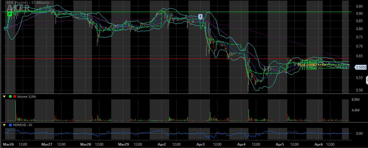 Further, going back to the 15 minute chart, 3/26 looked like a good move. I took that as a signal that this was ready to pop above that daily profit line. It gapped up 0.10 and held that day. Pre-market on 3/27 looked like it was trending higher at the beginning. So my entry was in anticipation of the blast-off. Which, as you can see, didn't ultimately happen.