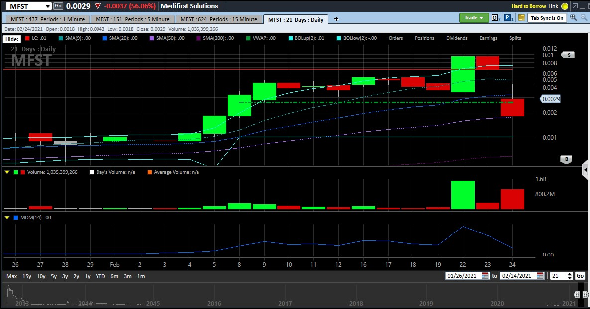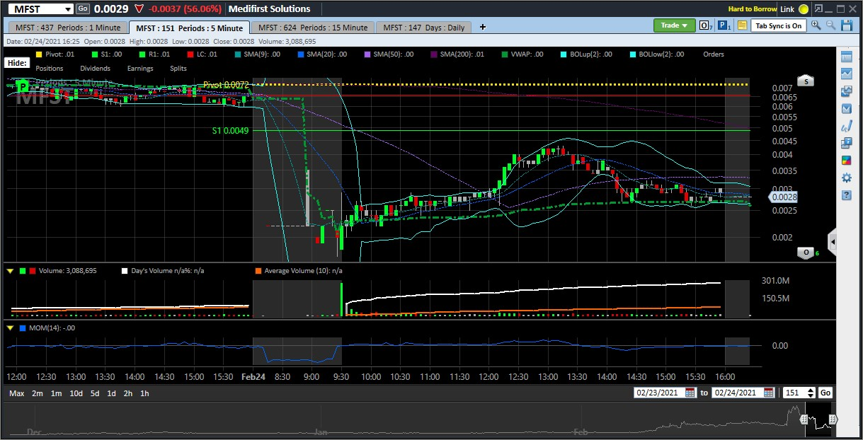 Then on the pre-market prep the next day, I watched closely for the Level2 change on $MFST to get a sense for how the ticker would react. Being an OTC, it doesn't trade pre-market, but the Level2 does adjust to show the best bid and ask just before the Open. I had first set all of my current position to sell at just under the best ask price which started at about $0.006. My prior day's position was bought at $0.0055 so I would be able to exit and maybe make a few dollars. But then the Level2 dropped down to about $0.002 and I reflected on the news and sentiment and formed a new strategy. The CEO was arrested for a fraud charge on price manipulation several years ago. There was nothing in there about the volume and price moves for 2/22. Further, the stock had been moving lately because of positive news regarding their business and I did not have the sense that losing a CEO would suddenly de-list the company. Instead, it was clear there would be negative market reaction but I reasoned there was a better short term chance that the stock would eventually (possibly in a few weeks) recover to what it was trading at on 2/23 and that would still get me out with some profit. I further reasoned that the worst scenario would be that the stock would drop to as low as $0.0001 (where it had been trading for the last half of last year), there would be panic selling and eager buying at the Open such that the stock would be halted, and that it may take several weeks for it to get back to its 2/23 or even 2/22 prices. Given that reasoning, I was confident in executing a new plan.