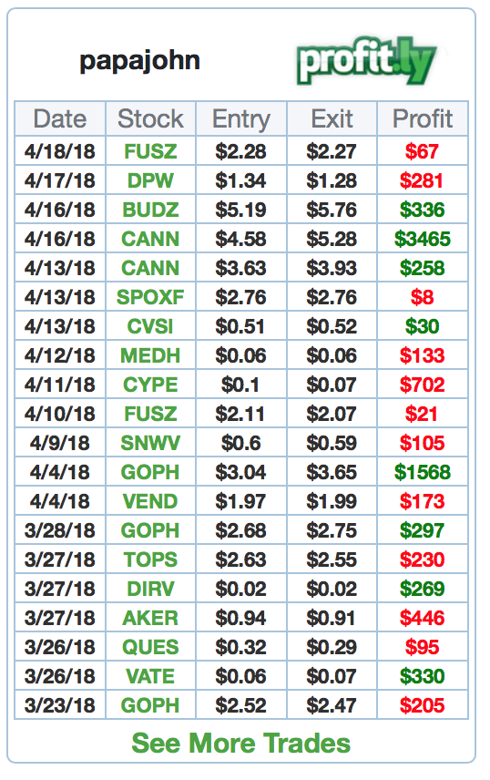 Things are feeling much better for me now. I have my confidence back, after it was shaken in February when I took a few very big losses. There was some good news in the cannabis sector which brought some life back to the OTC markets and led to my biggest single profit on a trade in $CANN. I've been losing slightly more trades than I'm winning recently, but I am keeping losses small and having some nice sized wins which are leading to overall profitability. I was also interviewed for the SteadyTrade podcast with Tim Bohen and Stephen Johnson, that was a lot of fun.