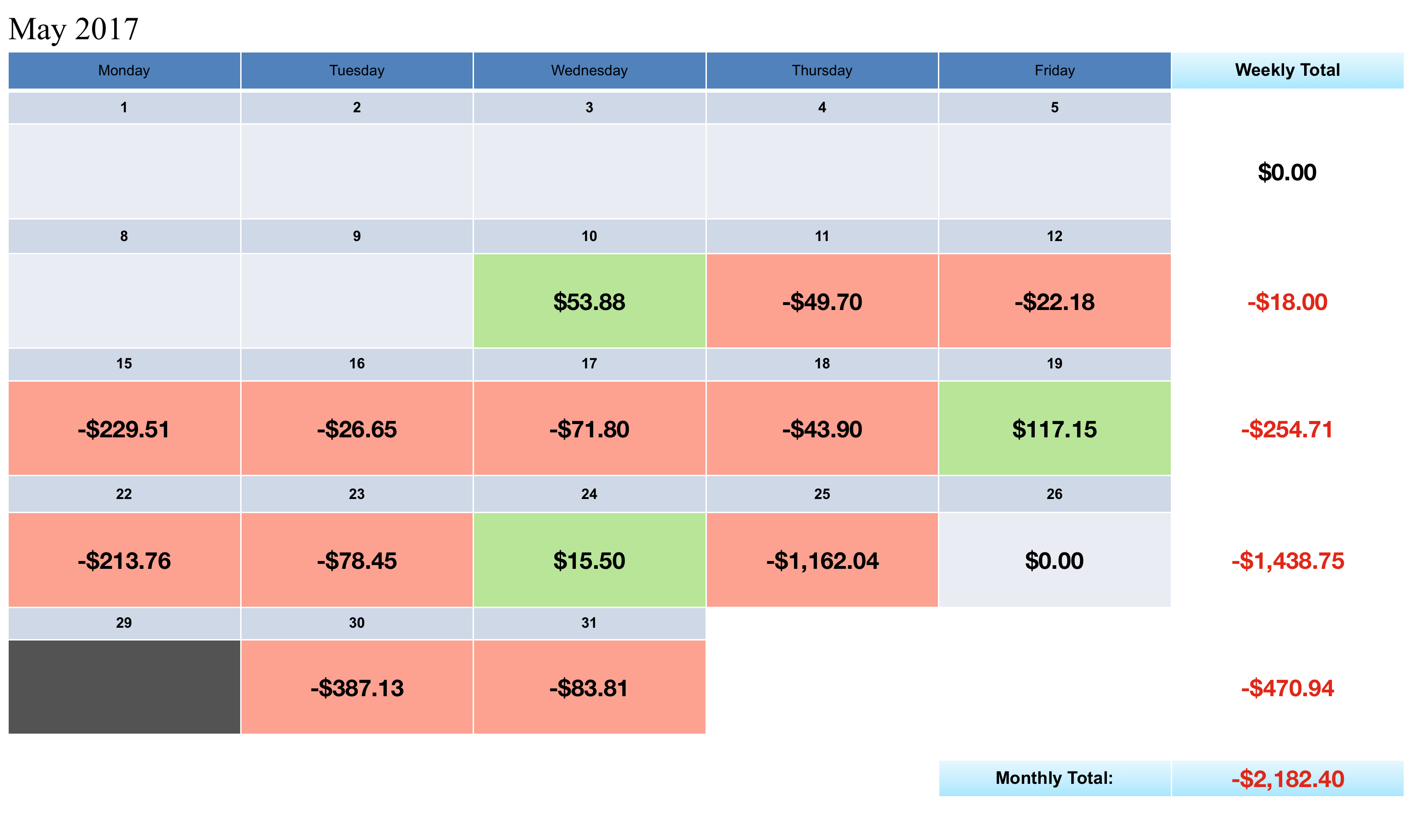 I made 36 trades that month, with 9 wins and 27 losses for a 25% win percentage and a loss of $2.2k. My average loss was also twice as big as my average win. I traded 15 days that month and averaged a loss of $145 per day.