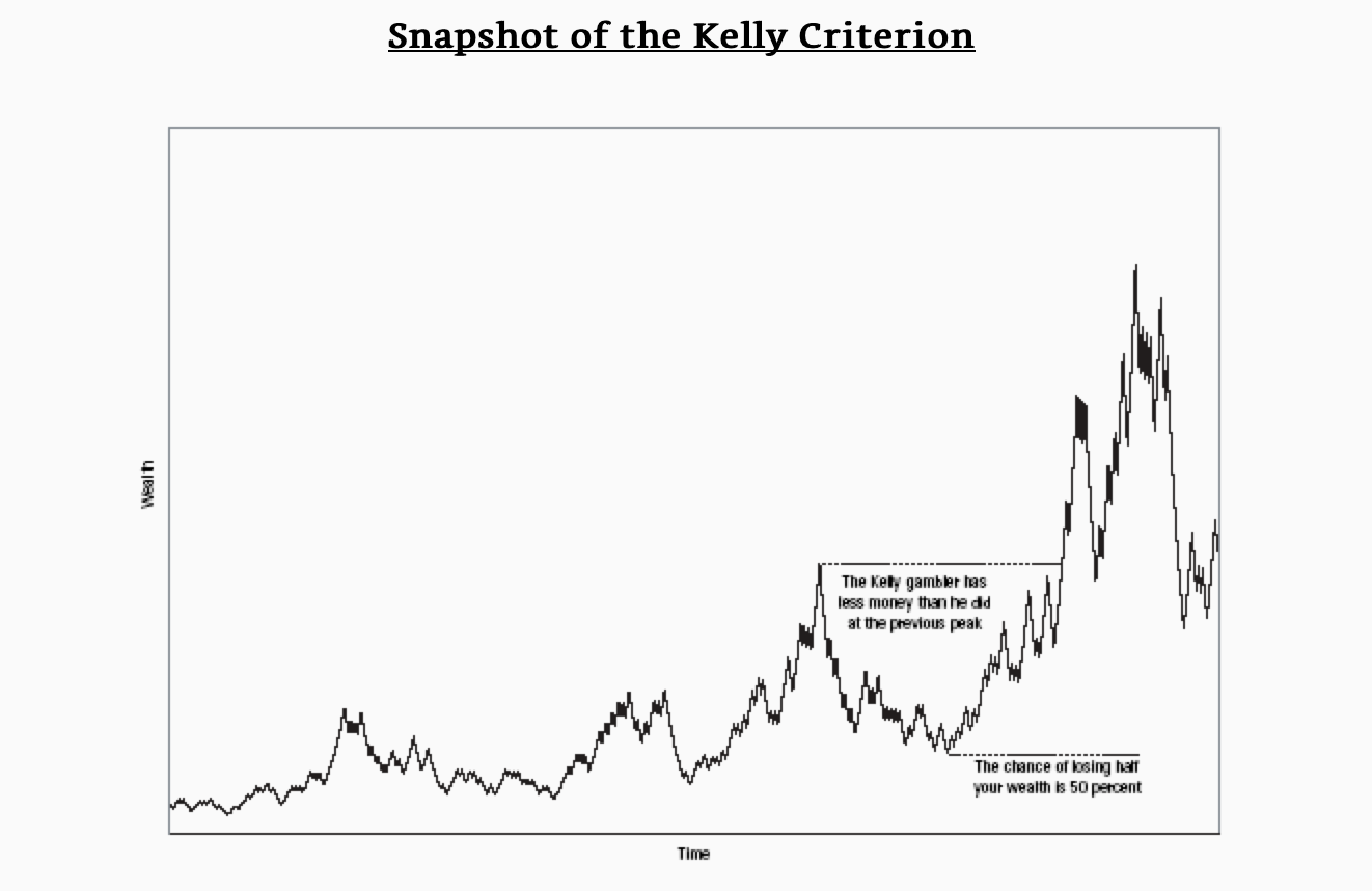 "This jagged mountain range can be a landscape of heartbreak. Suppose you found yourself at the top of the peak to the right of the center of the chart. Maybe that represents your first million. In this particular scenario, you are just about to lose most of it. The bankroll fluctuations in Kelly betting obey a simple rule. In an infinite series of serial Kelly bets, the chance of your bankroll ever dipping down to half its original size is… ½. This is exactly correct for an idealized game in which the betting is continuous. It is close to correct for the more usual case of discrete bets (blackjack, horse racing, etc.). A similar rule holds for any fraction 1/ n. The chance of ever dipping to 1/ 3 your original bankroll is 1/ 3. The chance of being reduced to 1 percent of your bankroll is 1 percent. The good news is that the chance of ever being reduced to zero is zero. Because you never go broke, you can always recover from losses."