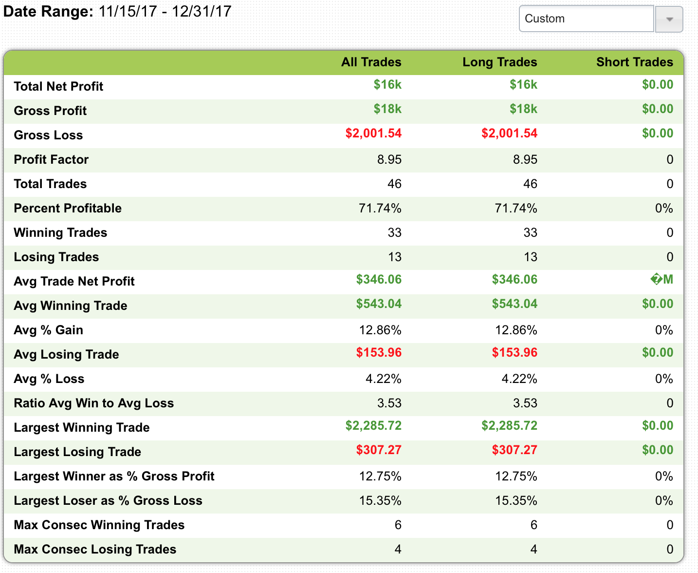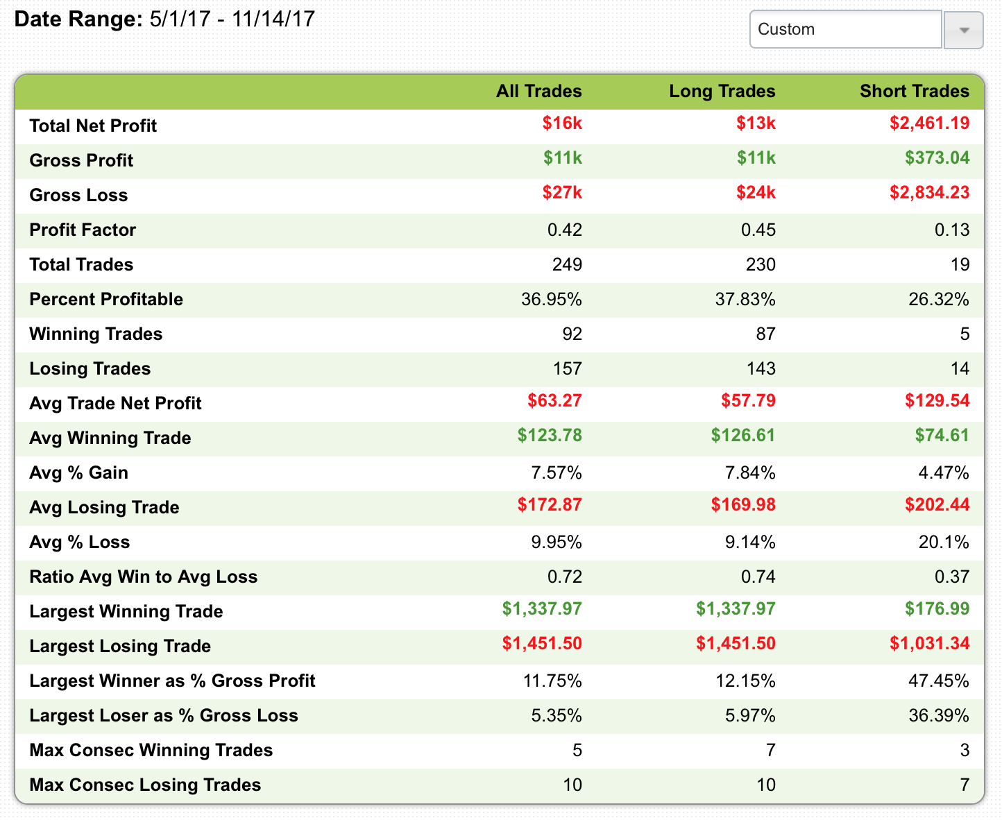 Here are my stats from the start up to November 14th. You can see I was only winning about 37% of the time and my average loss was larger than my average win.