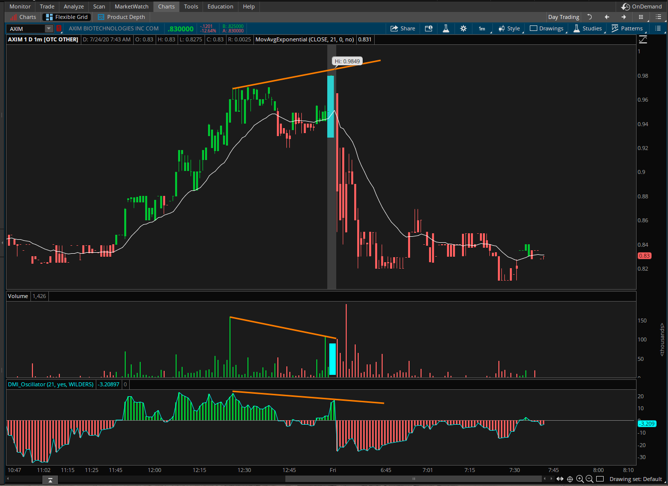 I went after this one this morning thinking there could be a continuation from yesterday. Needless to say I need to build my check list and follow it before placing a trade. I placed my order before the market opened (see blue rectangles). It went straight down at 6:30 PDT. My analysis after the move revealed quite a clear divergence from price action, volume and directional movement. I was dumb. If I would have done this first I probably would not have placed my order before the market opened.