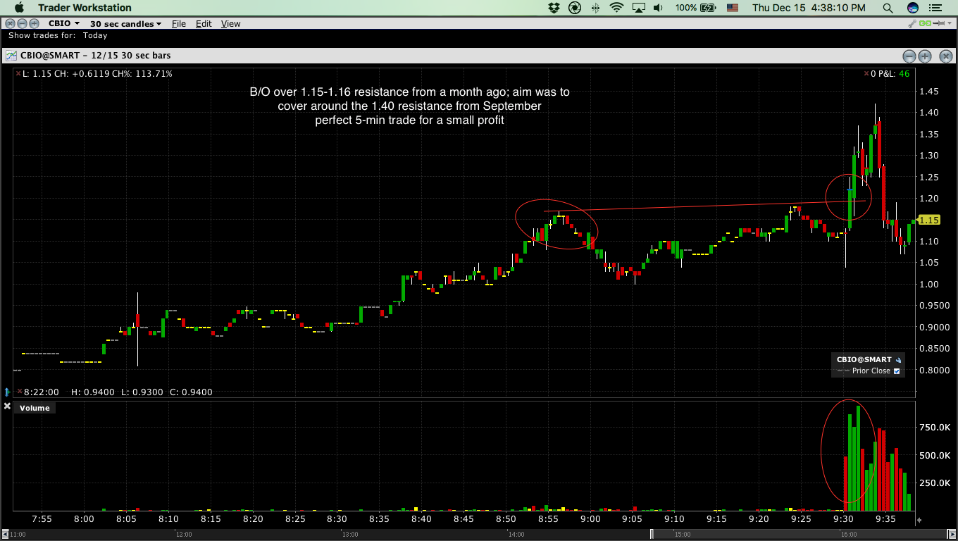$CBIO announced positive news about a contract with Pfizer at the market close on Dec 14th, which made the stock price to rise A/M. It eventually faded, but it held a good portion of its gains. Dec 15 P/M price action of the stock was uptrending decently and it was testing tech. resistance at 1.15-1.16 level(10/14 - 10/18). Passing by this level would have meant a B/O and a potential test of the previous day high of 1.27 (where the stock hesitated for a moment, but held its gain and continued spiking). There was a multi-month resistance at 1.40(Mid September), so this was my goal from the very beginning. I got out near the top for a 10% gain on my money.