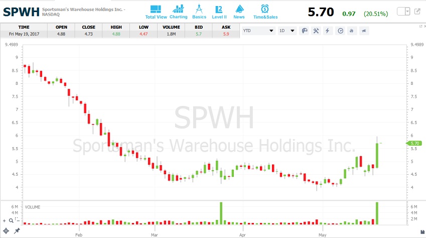 $SPWH - Earnings winner. Good gains strong EOD push. Over $6 with volume perhaps another leg up. It gave a great dip-buy previously so perhaps the same is in order.