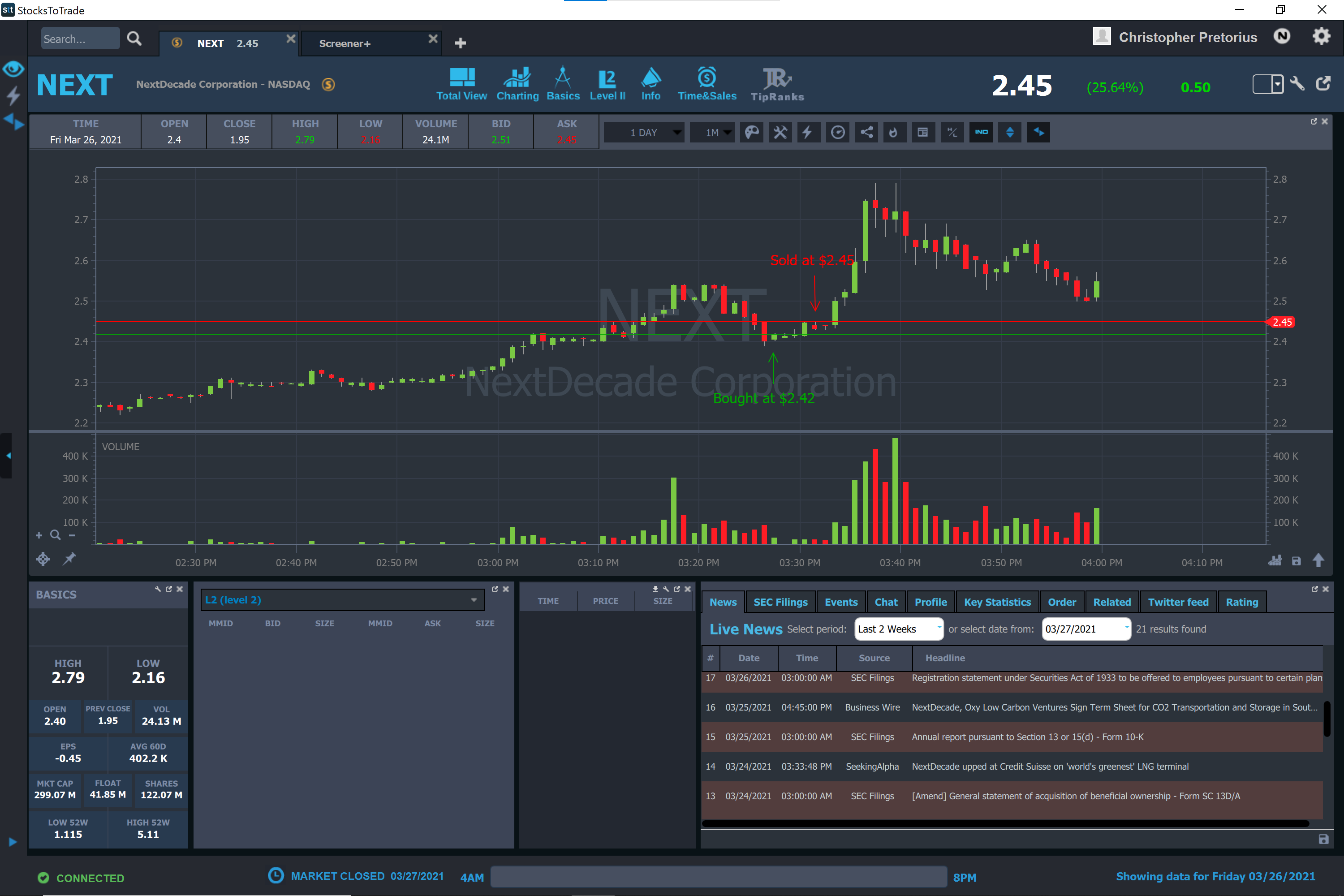 I am only able to day trade one day a week, so I am finding it hard to stick to my plan and my rules sometimes. Something I've been struggling with is patience. I am also very worried about my win percentage, even though I know I shouldn't be. Take this ridiculous trade below for instance. So I dip bought this stock and immediately had unrealized profits. Then I got one red candle and started watching my profits go away. I cut the trade on that red candle because I wanted to have a winning trade and completely forgot about my vow to be more patient. After my sell order was filled I sat there and watched the stock spike to the $2.70s without me. It would have been one of the best day trades I've had. Instead, I'm left to fix these problems. I know my conviction in a lot of the trades I enter has taken a hit since the market shifted. I am also a newbie so I haven't traded in different market environments. I do know that no matter what the state of the market is I need to stick to my rules and my plan. Going forward I will fix this. I am going to print this chart out and write "Stick to your plan and Be Patient!" and hang it on my bathroom mirror so it gets burned into my brain. Here's to better trading. Always be learning! Cheers fellow traders! Thanks for reading.