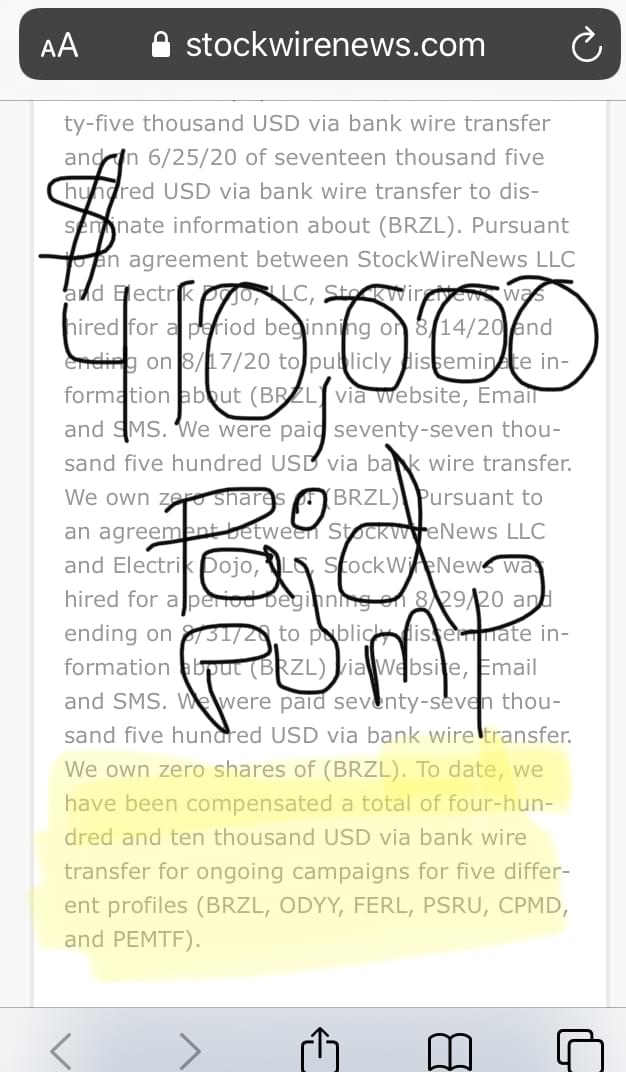 watching these pumps since they have been paid damn near half million to pump those tickets. With BRZL being most recent paid pump! Also found a new pumper from reading the disclaimer to add which is Electrik DoJo, I did not look them up yet, but I will be and if I find a site I will be adding email to subscriber list. Then I can check the time difference between them and stockwire news and find out which emailer or SMS is going out first! Hope this helps anyone else! Study up and never give up! It gets easier the more you know and understand: esp when you know what to look for and I have to thank Tim for teaching the dark side rules of the game! And I know trading is not a game. It’s just a saying for me!
