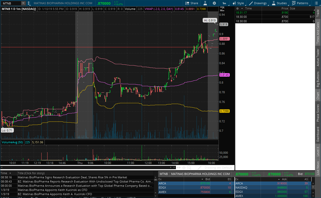MTNB intraday chart Today 1/10/19 0.91 cents after-hours