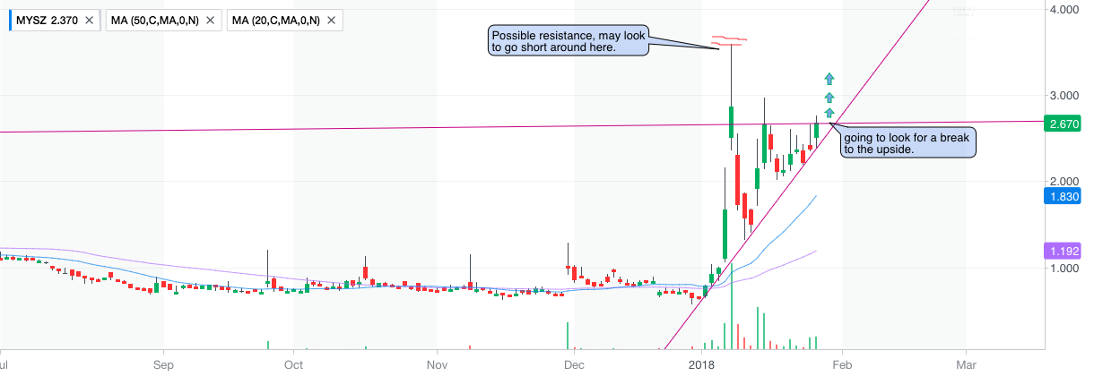 MYSZ- low float stock trending above 20/50 day moving averages. Short interest increase/decrease 88% 0.1 days to cover.