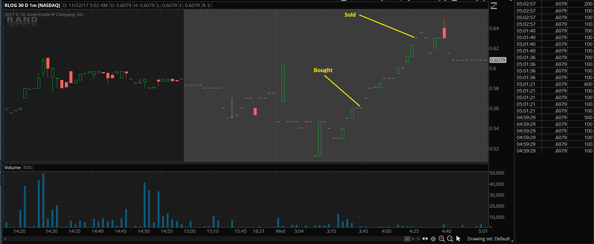 I hit a really early move on $RLOG, got in and out because of a partial fill and because I didn't want to stay up watching it, and it turns out that was the move of the day for it. My thesis was completely wrong for the day though, as once 6am hit, it tanked, and while I was power napping to the open, it would have been a decent buy around .35c and sell into the move of .45c going into the open, but nothing great honestly.