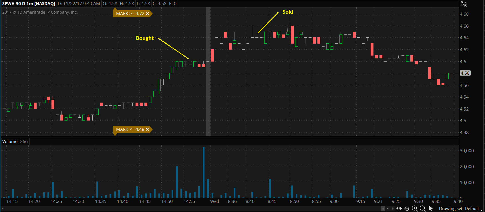 I got out of my $SPWH position because of low volume, and a day that seemed to be trending to the negative side. Thus far, the move that was made I hit, but it was a small move, and well, rather boring.