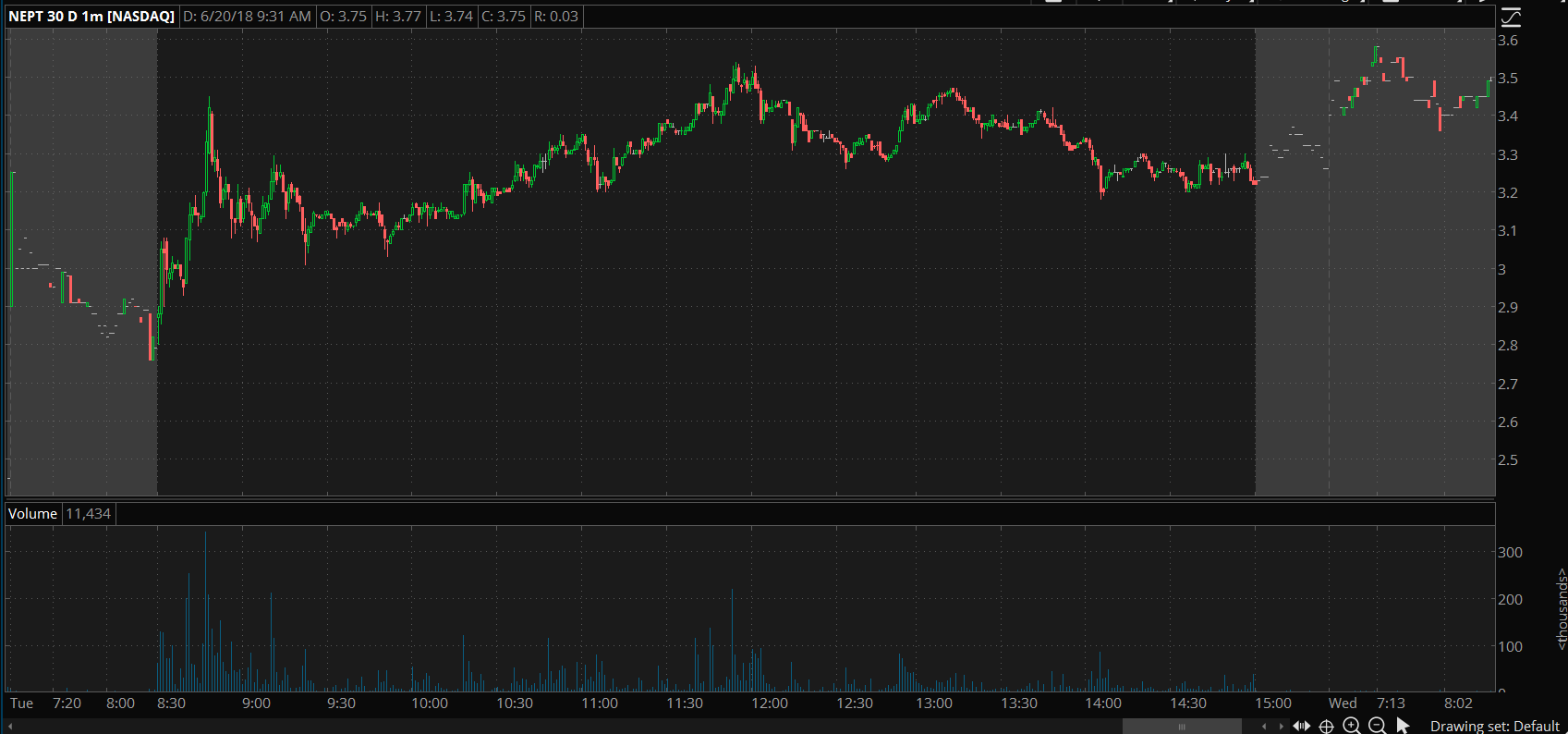 $NEPT was on my watchlist for a potential 2nd green day gap and go. I didn't have a winning trade yesterday because I just didn't have a winning plan that would have worked out, something I've been trying to get better at, but I'm just not good at it. It has a 54m float (around $VSTM) and it's in the perfect price range for me to trade.