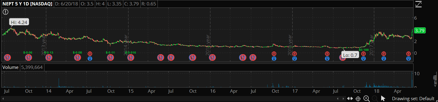 $NEPT Was a little play I was looking at the other day but decided not to go with it. I was watching it late afternoon on 18th right as it was comming out of its wedge , 3:35 would have been my entry. But would not have held it for more than a day. I'm not any good at a stair step pattern. Yes this is a play , I stay away from tickers that are 1-4 a share . Everyone's diffrent..