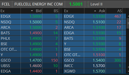 After $1.65 presented itself as the new resistance, and rejected, I knew it was time to sit back and wait. No way I am buying any weakness without letting the bottom form. The bottom did eventually form, near the close at $1.50. Level 2 showed the following: