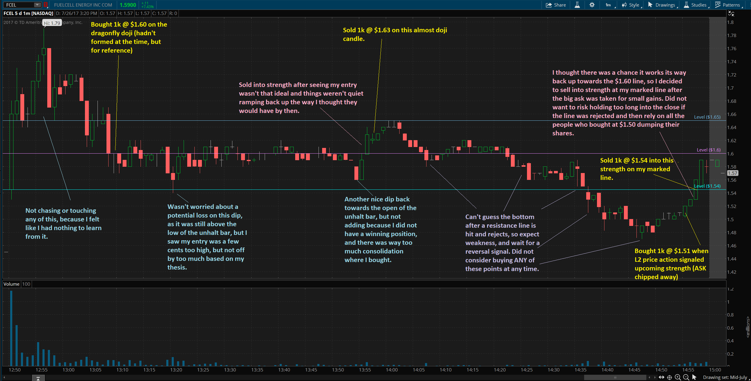 Before I post the annotated chart of my trades, I want to go over something important for these types of trades. First, if you have a 4-digit or below account, don't try to emulate this stuff, terrible R/R and chances are, you'll waste a day trade. Second, understand where risk comes from.