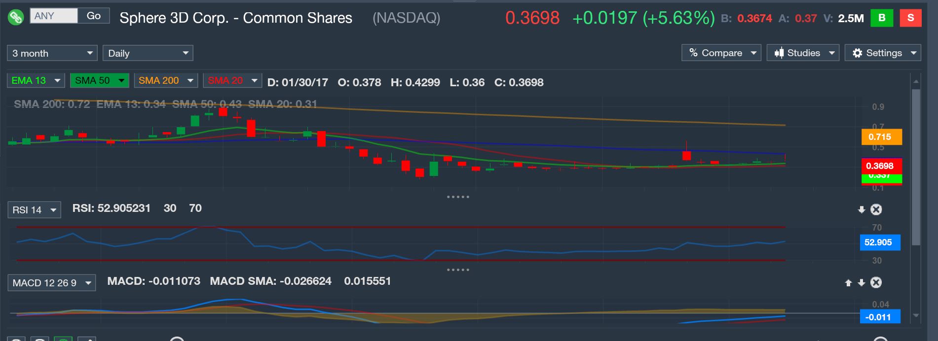 Sphere 3D Corp (Ticker: ANY) has some sketchy technicals right now, but it looks to be in consolidation. That being said, it's still a penny stock trading between .30-.40 a share meaning I can actually use some good leverage despite my small brokerage account. What moved me to really buy this stock though was the fundamentals! 6 hours ago they announced the acquisition of 2 other tech companies that could potentially help this company thrive like never before, and I'm betting that a lot of traders haven't seen this yet, as I had to do quite a bit of digging to find the stock myself. Not only have they finalized their acquisition of 2 supportive companies to their endeavors, but they also started a large advertising campaign on the 26th for their Glassware 2.0 technology which is currently on Microsoft Azure. With so much positive news and growth of the company lately, I believe this is a penny stock that could actually have sustained growth, and I'd kick myself for not being a part of it several months from now.