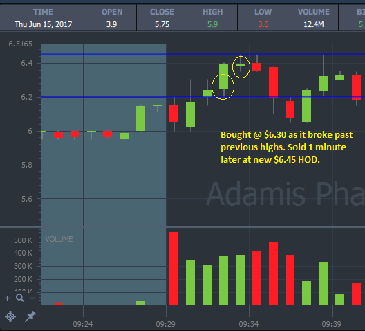 I had set a horizontal line on the StT chart to indicate the previous high on this 2-day runner. My intention was to go long if it broke through $6.20 but missed my entry due to watching too many charts. Put in a limit order for 500 shares at $6.30 but only filled 300 shares. 1 minute later the stock was running up to $6.45 so I took profits, which was well-timed as it turned out to be the HOD (so far), and shortly after it faded.